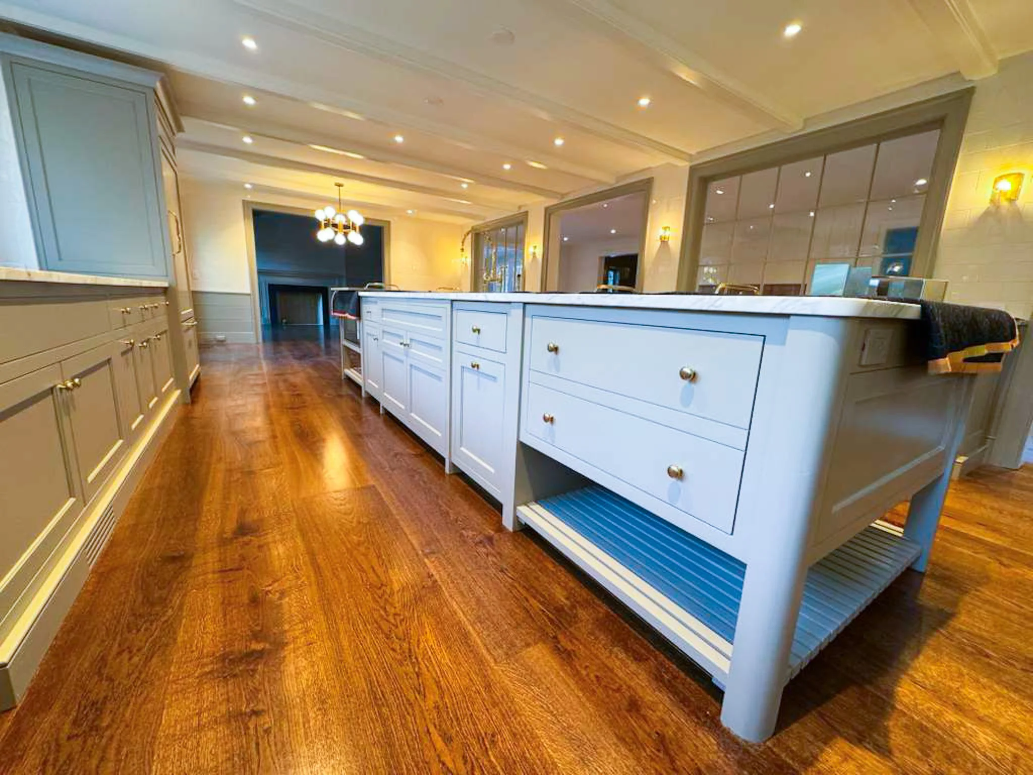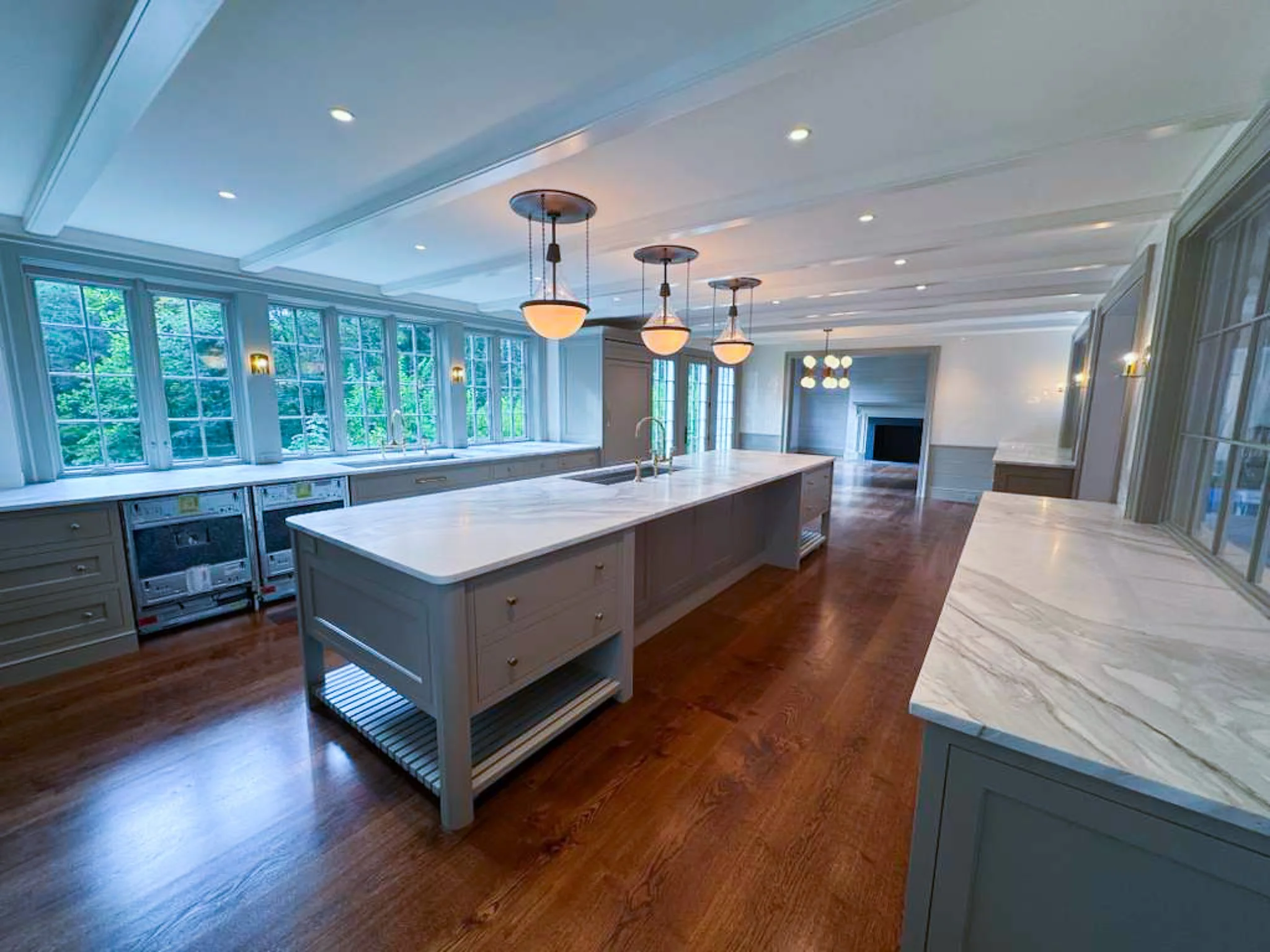 This elegant traditional kitchen exemplifies timeless design and exceptional craftsmanship. Working in close collaboration with the design team, Pro Kriss created a comprehensive cabinetry system featuring soft gray painted inset cabinets, multiple work zones with marble countertops, and warm brass hardware throughout—all within an expansive open-concept layout flooded with natural light.